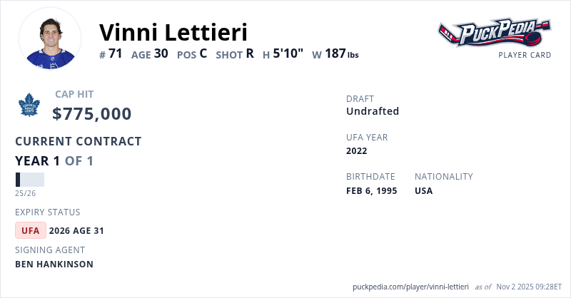 Vinni Lettieri is signed to a 1 year, $775,000 contract with a cap hit of $775,000 per season, playing for the Toronto Maple Leafs. His contract expires at the end of the 2025-26 season, making Lettieri an Unrestricted Free Agent.