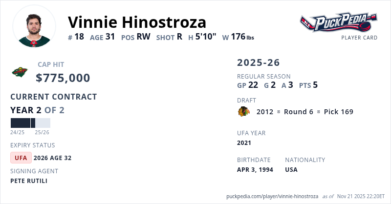 Vinnie Hinostroza is signed to a 2 year, $1,550,000 contract with a cap hit of $775,000 per season, playing for the Minnesota Wild. His contract expires at the end of the 2025-26 season, making Hinostroza an Unrestricted Free Agent.