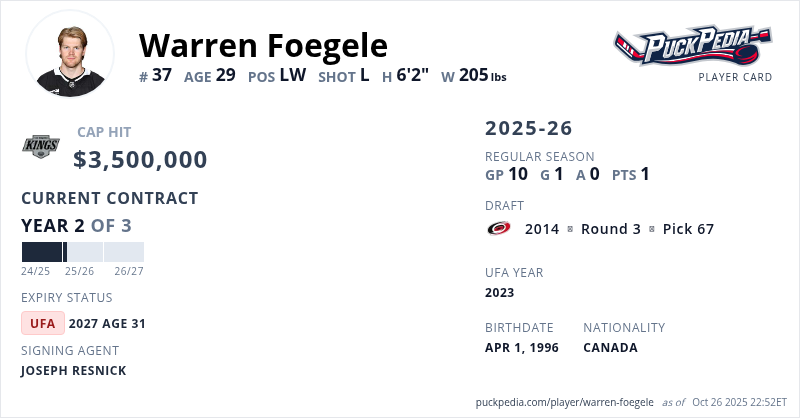 Warren Foegele is signed to a 3 year, $10,500,000 contract with a cap hit of $3,500,000 per season, playing for the Los Angeles Kings. His contract expires at the end of the 2026-27 season, making Foegele an Unrestricted Free Agent.