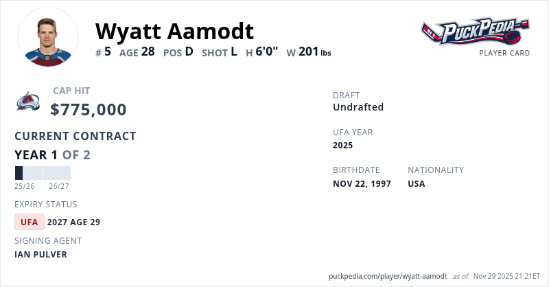 Wyatt Aamodt is signed to a 2 year, $1,550,000 contract with a cap hit of $775,000 per season, playing for the Colorado Avalanche. His contract expires at the end of the 2026-27 season, making Aamodt an Unrestricted Free Agent.