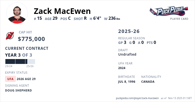 Zack MacEwen is signed to a 3 year, $2,325,000 contract with a cap hit of $775,000 per season, playing for the New Jersey Devils. His contract expires at the end of the 2025-26 season, making MacEwen an Unrestricted Free Agent.