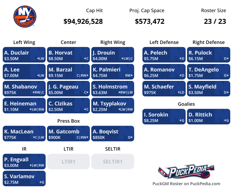 The New York Islanders opened the season with 23 players on their roster, including 14 forwards, 7 defensemen, and 2 goalies, leaving them with $573K in projected cap space. Pierre Engvall and Semyon Varlamov begin the year on injured reserve, while Cal Ritchie is on season-opening IR with a $77K cap charge. The team also carries a $600K bonus overage.