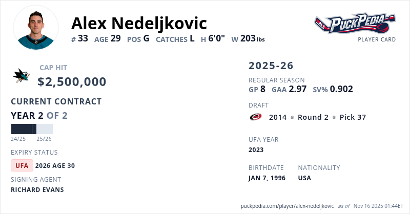 Alex Nedeljkovic is signed to a 2 year, $5,000,000 contract with a cap hit of $2,500,000 per season, playing for the San Jose Sharks. His contract expires at the end of the 2025-26 season, making Nedeljkovic an Unrestricted Free Agent.
