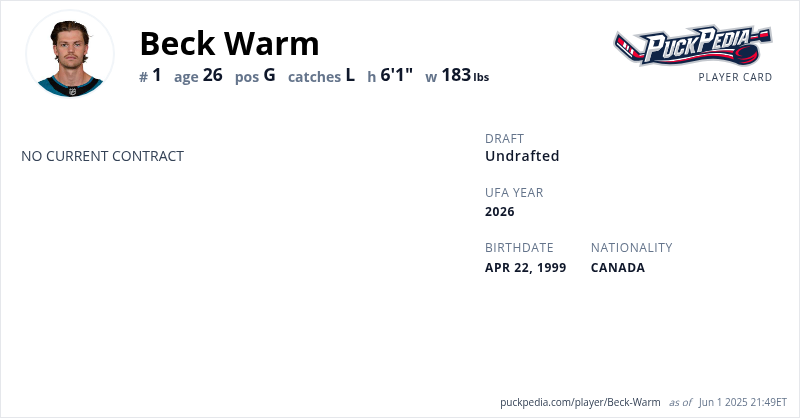 Beck Warm is an Unrestricted Free Agent (No Qualifying Offer). His last contract was 2 years, $1,500,000 with a cap hit of $750,000 per season. It expired at the end of the 2021-22 season.