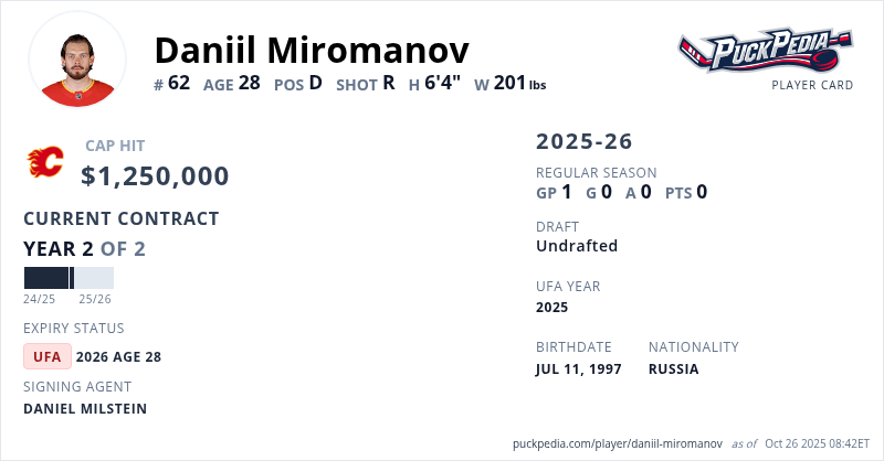 Daniil Miromanov is signed to a 2 year, $2,500,000 contract with a cap hit of $1,250,000 per season, playing for the Calgary Flames. His contract expires at the end of the 2025-26 season, making Miromanov an Unrestricted Free Agent.