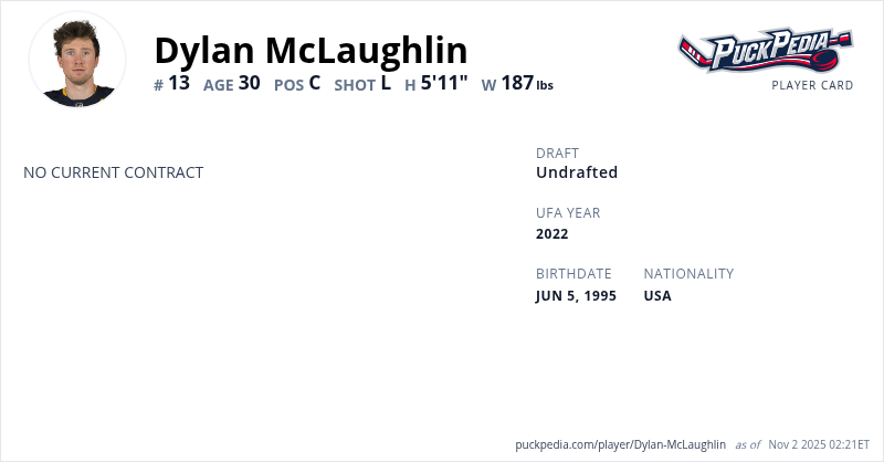 Dylan McLaughlin is an Unrestricted Free Agent. His last contract was 1 year, $750,000 with a cap hit of $750,000 per season. It expired at the end of the 2022-23 season.