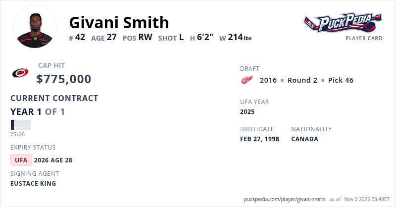 Givani Smith is signed to a 1 year, $775,000 contract with a cap hit of $775,000 per season, playing for the Carolina Hurricanes. His contract expires at the end of the 2025-26 season, making Smith an Unrestricted Free Agent.