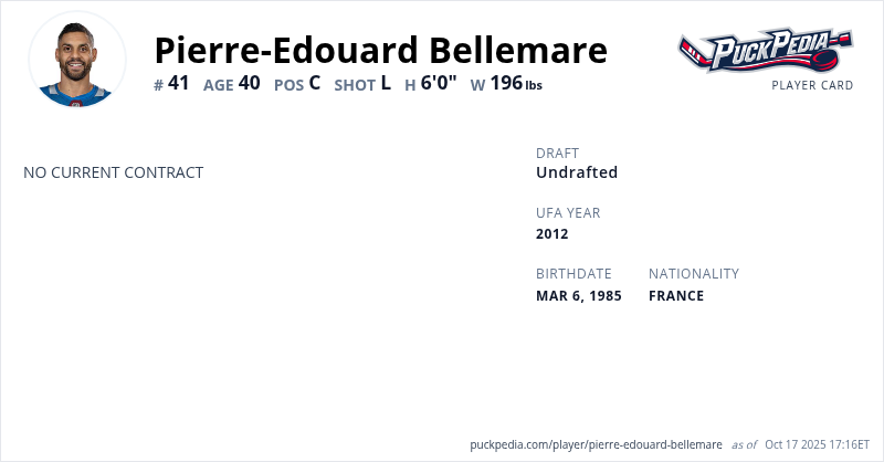 Pierre-Edouard Bellemare is an Unrestricted Free Agent. His last contract was 1 year, $775,000 with a cap hit of $775,000 per season. It expired at the end of the 2023-24 season.