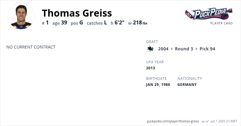 Thomas Greiss is an Unrestricted Free Agent. His last contract was 1 year, $1,250,000 with a cap hit of $1,250,000 per season. It expired at the end of the 2022-23 season.