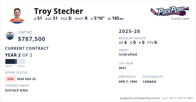 Troy Stecher is signed to a 2 year, $1,575,000 contract with a cap hit of $787,500 per season, playing for the Edmonton Oilers. His contract expires at the end of the 2025-26 season, making Stecher an Unrestricted Free Agent.