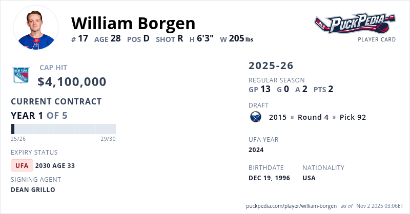 William Borgen is signed to a 5 year, $20,500,000 contract with a cap hit of $4,100,000 per season, playing for the New York Rangers. His contract expires at the end of the 2029-30 season, making Borgen an Unrestricted Free Agent.