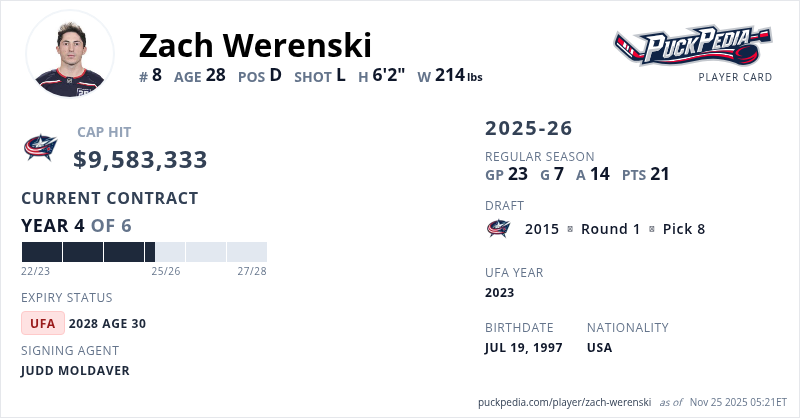 Zach Werenski is signed to a 6 year, $57,500,000 contract with a cap hit of $9,583,333 per season, playing for the Columbus Blue Jackets. His contract expires at the end of the 2027-28 season, making Werenski an Unrestricted Free Agent.