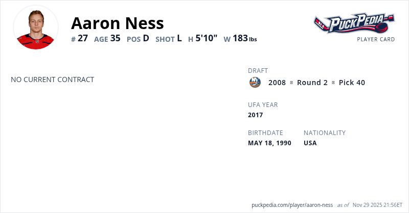 Aaron Ness is an Unrestricted Free Agent. His last contract was 2 years, $1,450,000 with a cap hit of $725,000 per season. It expired at the end of the 2020-21 season.