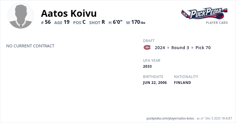 | 2024-25 | 18 | Liiga | TPS | 32 | 1 | 7 | 8 | 10 | Playoffs | 2 | 0 | 0 | 0 | 0 | ||||||||||||||||
