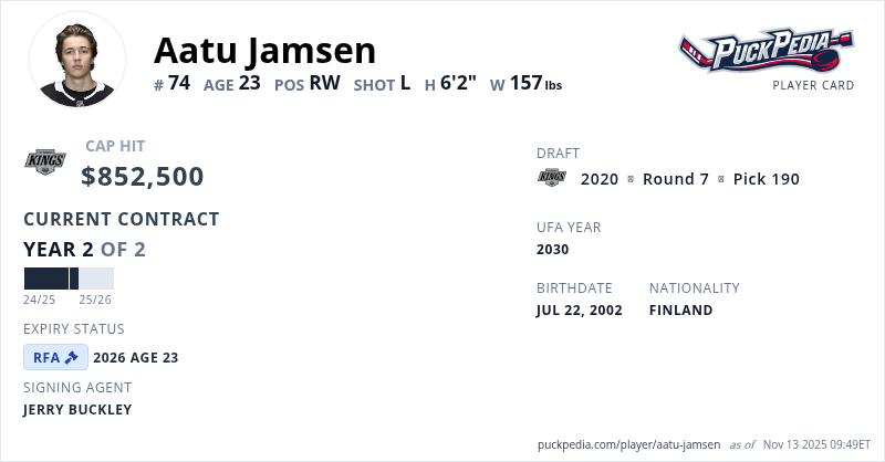 Aatu Jamsen is signed to a 2 year, $1,705,000 contract with a cap hit of $852,500 per season, playing for the Los Angeles Kings. His contract expires at the end of the 2025-26 season, making Jamsen a Restricted Free Agent.
