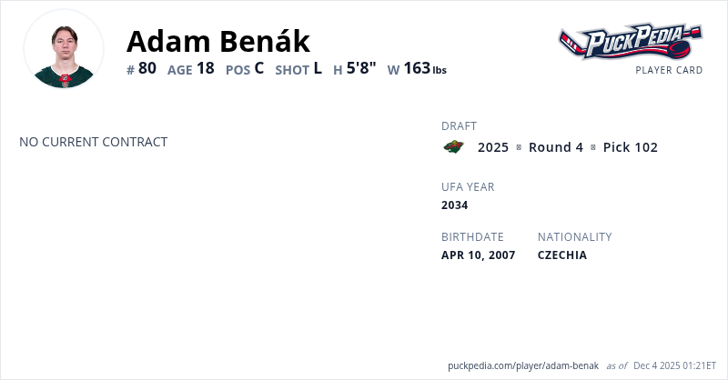 Benak was the 102nd overall pick by Minnesota in the 2025 NHL Entry Draft on Saturday.