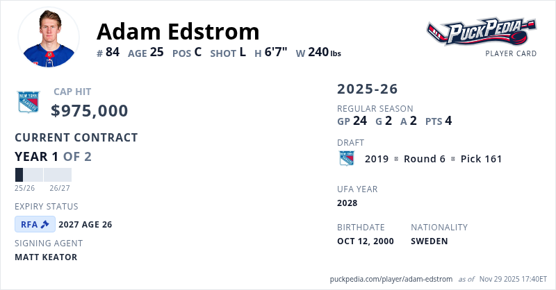 Adam Edstrom is signed to a 2 year, $1,950,000 contract with a cap hit of $975,000 per season, playing for the New York Rangers. His contract expires at the end of the 2026-27 season, making Edstrom a Restricted Free Agent.