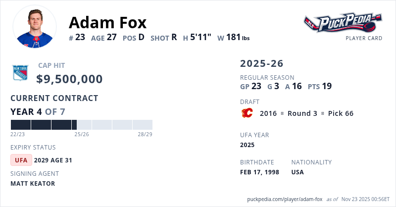 Adam Fox is signed to a 7 year, $66,500,000 contract with a cap hit of $9,500,000 per season, playing for the New York Rangers. His contract expires at the end of the 2028-29 season, making Fox an Unrestricted Free Agent.