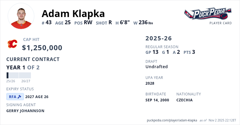 Adam Klapka is signed to a 2 year, $2,500,000 contract with a cap hit of $1,250,000 per season, playing for the Calgary Flames. His contract expires at the end of the 2026-27 season, making Klapka a Restricted Free Agent.
