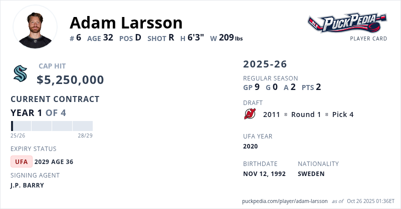 Adam Larsson is signed to a 4 year, $21,000,000 contract with a cap hit of $5,250,000 per season, playing for the Seattle Kraken. His contract expires at the end of the 2028-29 season, making Larsson an Unrestricted Free Agent.