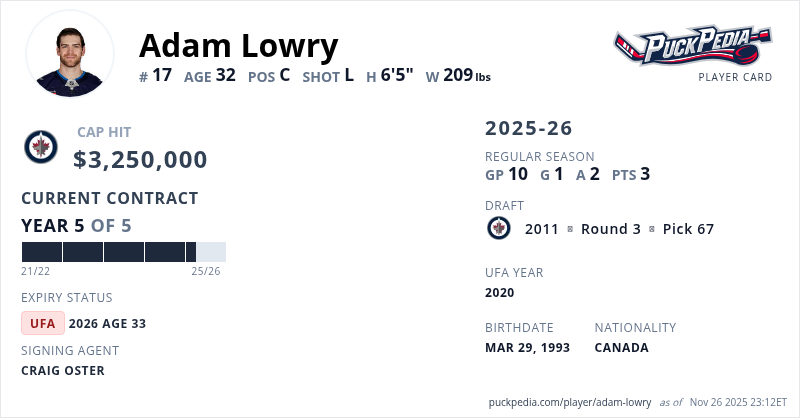 Adam Lowry is signed to a 5 year, $25,000,000 contract extension with a cap hit of $5,000,000 per season. He plays for the Winnipeg Jets. His next contract begins for the 2026-27 season and expires at the end of the 2030-31 season, making him an Unrestricted Free Agent.