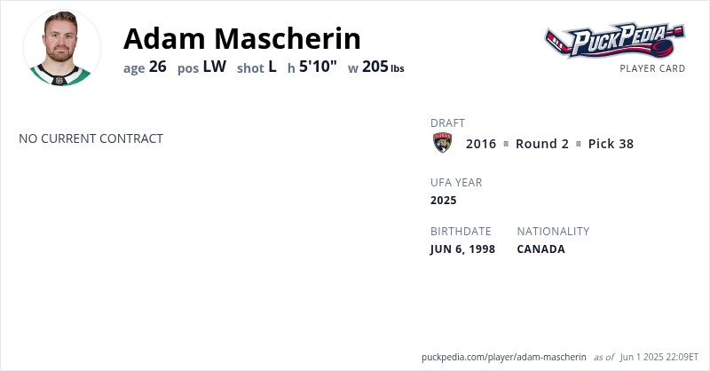 Adam Mascherin is a Restricted Free Agent. His last contract was 3 years, $2,325,000 with a cap hit of $775,000 per season. It expired at the end of the 2020-21 season.