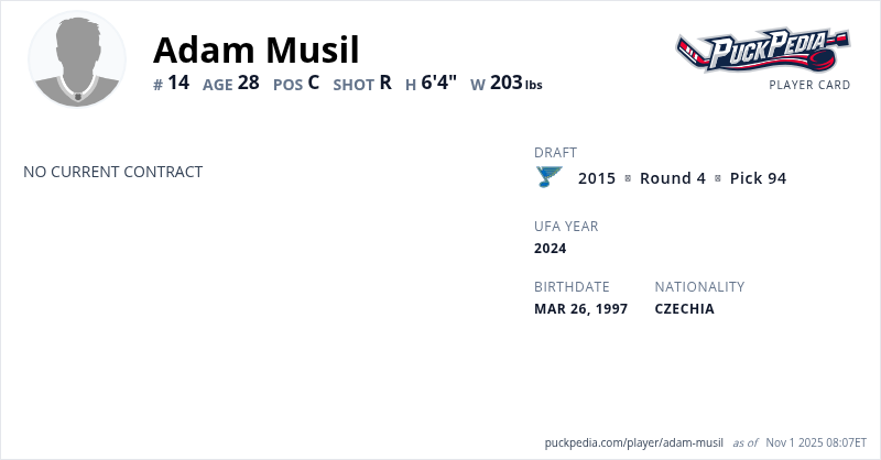 Adam Musil is a Restricted Free Agent. His last contract was 3 years, $2,197,500 with a cap hit of $732,500 per season. It expired at the end of the 2019-20 season.