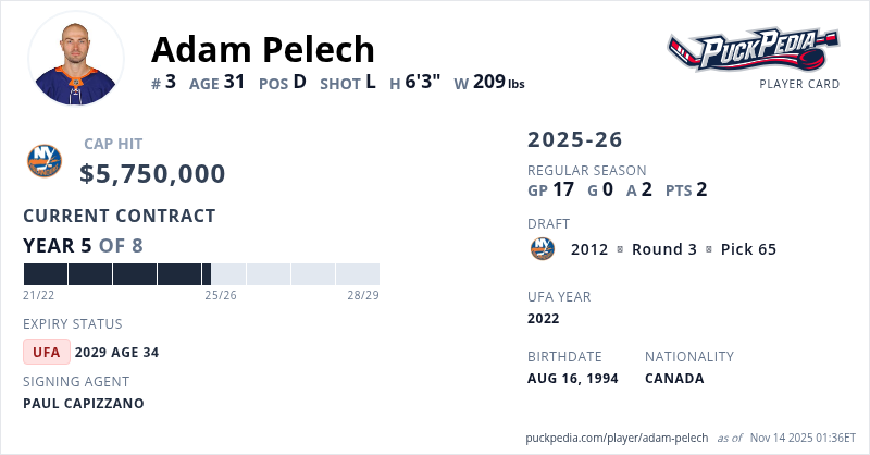 Adam Pelech is signed to a 8 year, $46,000,000 contract with a cap hit of $5,750,000 per season, playing for the New York Islanders. His contract expires at the end of the 2028-29 season, making Pelech an Unrestricted Free Agent.