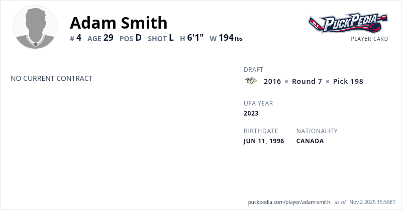 | 2021-22 | 25 | ECHL | Wheeling Nailers | 66 | 5 | 18 | 23 | 60 | Playoffs | 11 | 0 | 0 | 0 | 0 | ||||||||||||||||
