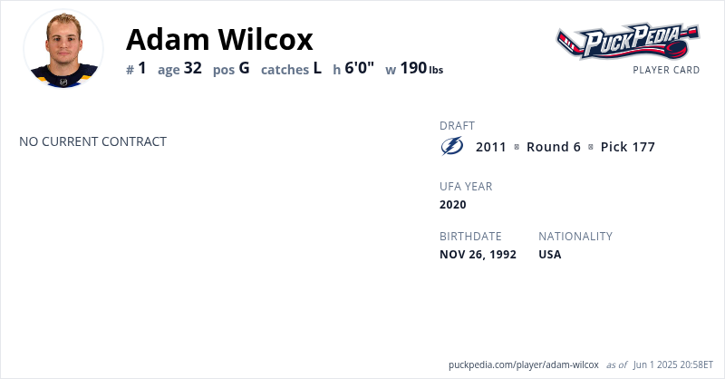 Adam Wilcox is an Unrestricted Free Agent. His last contract was 1 year, $650,000 with a cap hit of $650,000 per season. It expired at the end of the 2018-19 season.
