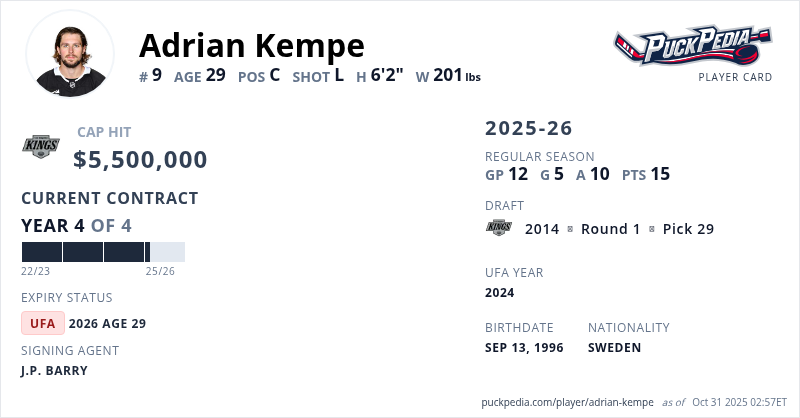 Adrian Kempe is signed to a 4 year, $22,000,000 contract with a cap hit of $5,500,000 per season, playing for the Los Angeles Kings. His contract expires at the end of the 2025-26 season, making Kempe an Unrestricted Free Agent.