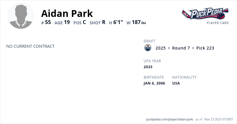 | 2024-25 | 18 | WHL | Calgary Hitmen | 0 | 0 | 0 | 0 | 0 | Playoffs | 3 | 0 | 0 | 0 | 0 | ||||||||||||||||