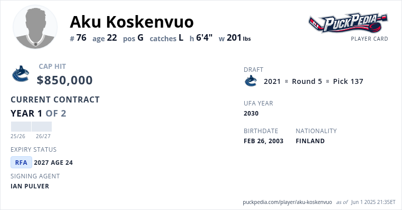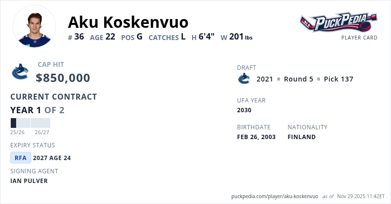 Aku Koskenvuo is signed to a 2 year, $1,700,000 contract with a cap hit of $850,000 per season, playing for the Vancouver Canucks. His contract expires at the end of the 2026-27 season, making Koskenvuo a Restricted Free Agent.