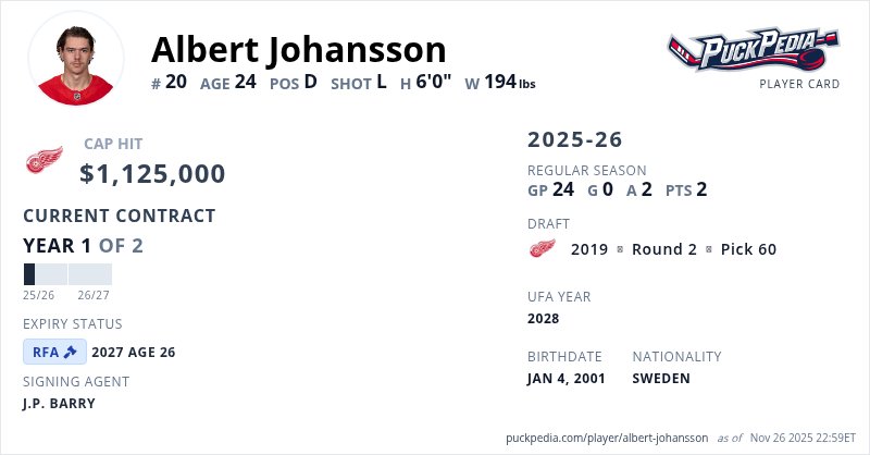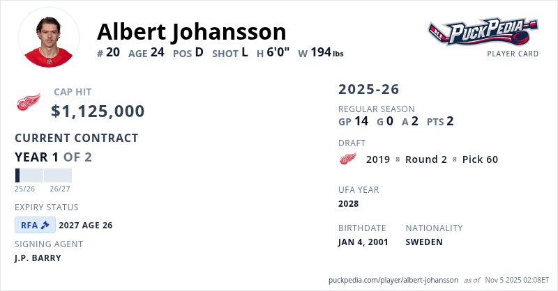 Albert Johansson is signed to a 2 year, $2,250,000 contract with a cap hit of $1,125,000 per season, playing for the Detroit Red Wings. His contract expires at the end of the 2026-27 season, making Johansson a Restricted Free Agent.