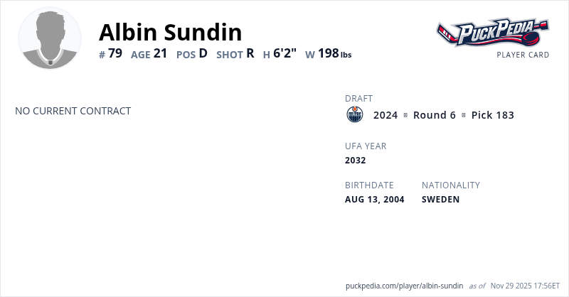 | 2024-25 | 20 | SHL | Frölunda HC | 25 | 0 | 0 | 0 | 6 | Playoffs | 6 | 0 | 0 | 0 | 0 | ||||||||||||||||