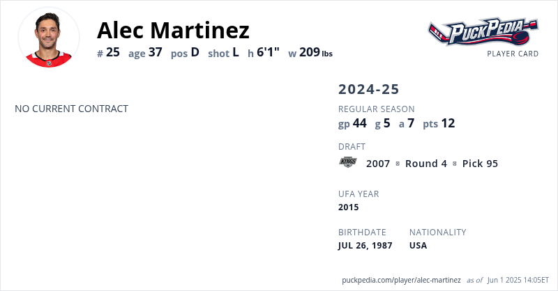 Alec Martinez is an Unrestricted Free Agent. His last contract was 1 year, $4,000,000 with a cap hit of $4,000,000 per season. It expired at the end of the 2024-25 season.