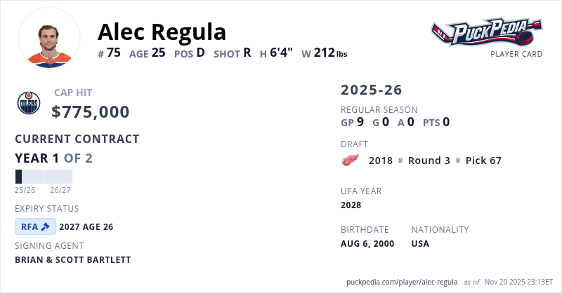 Alec Regula is signed to a 2 year, $1,550,000 contract with a cap hit of $775,000 per season, playing for the Edmonton Oilers. His contract expires at the end of the 2026-27 season, making Regula a Restricted Free Agent.