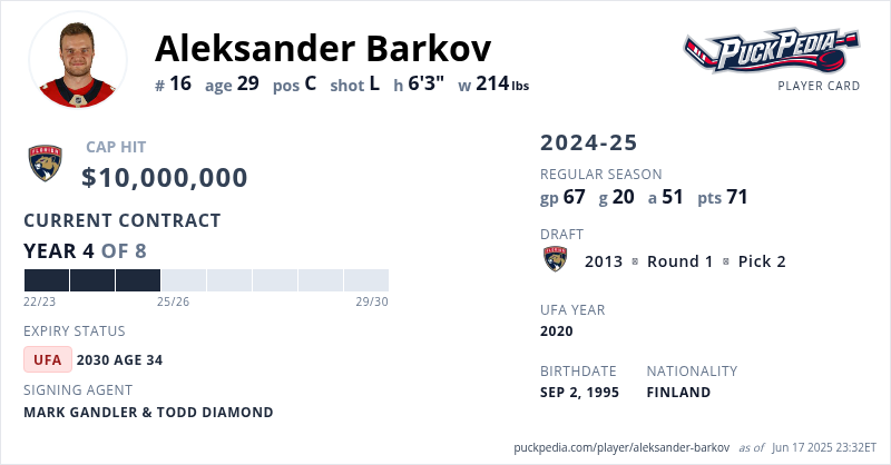 Aleksander Barkov is signed to a 8 year, $80,000,000 contract with a cap hit of $10,000,000 per season, playing for the Florida Panthers. His contract expires at the end of the 2029-30 season, making Barkov an Unrestricted Free Agent.