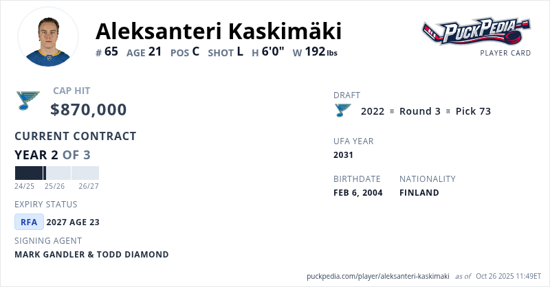 Aleksanteri Kaskimäki is signed to a 3 year, $2,610,000 contract with a cap hit of $870,000 per season, playing for the St. Louis Blues. His contract expires at the end of the 2026-27 season, making Kaskimäki a Restricted Free Agent.