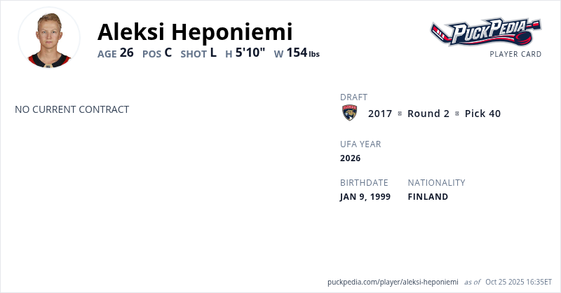 Aleksi Heponiemi is a Restricted Free Agent. His last contract was 1 year, $750,000 with a cap hit of $750,000 per season. It expired at the end of the 2022-23 season.