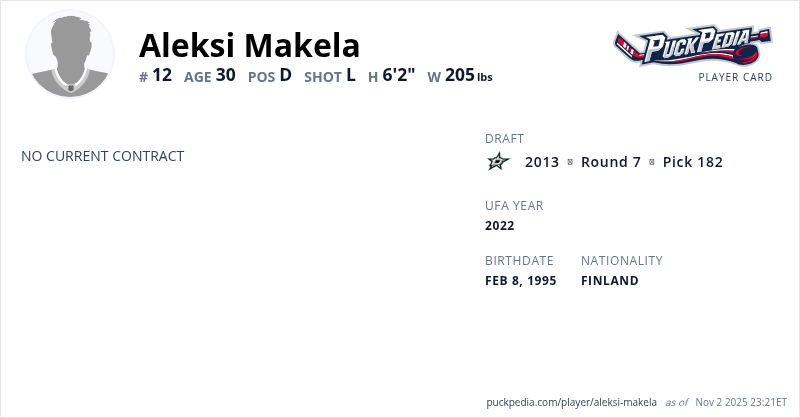 | 2016-17 | 21 | Liiga | Ässät | 48 | 0 | 2 | 2 | 26 | Playoffs | 3 | 0 | 0 | 0 | 0 | ||||||||||||||||