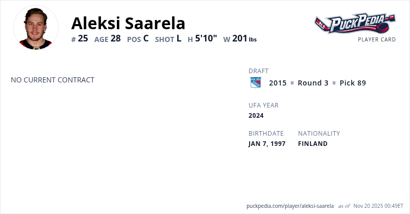 Aleksi Saarela is a Restricted Free Agent. His last contract was 3 years, $2,259,999 with a cap hit of $753,333 per season. It expired at the end of the 2019-20 season.