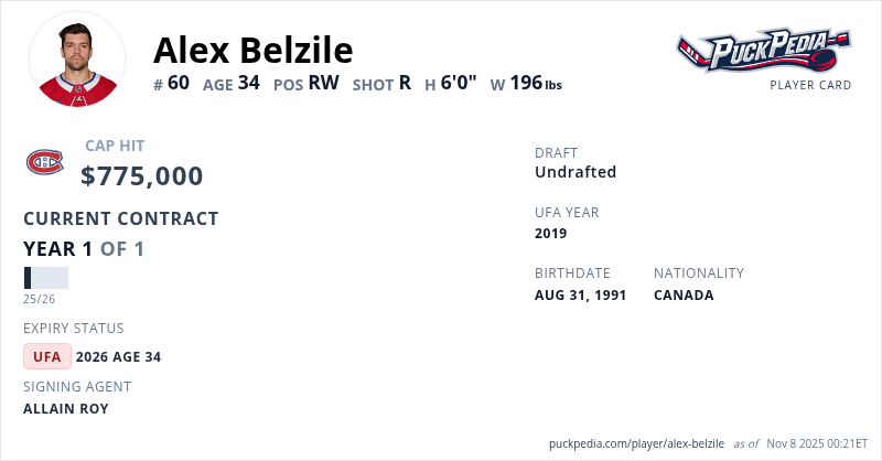 Alex Belzile is signed to a 1 year, $775,000 contract with a cap hit of $775,000 per season, playing for the Montreal Canadiens. His contract expires at the end of the 2025-26 season, making Belzile an Unrestricted Free Agent.