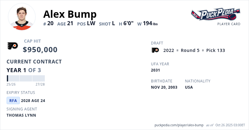 Alex Bump is signed to a 3 year, $2,850,000 contract with a cap hit of $950,000 per season, playing for the Philadelphia Flyers. His contract expires at the end of the 2027-28 season, making Bump a Restricted Free Agent.