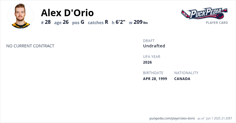 Alex D'Orio is an Unrestricted Free Agent (No Qualifying Offer). His last contract was 3 years, $2,199,999 with a cap hit of $733,333 per season. It expired at the end of the 2021-22 season.