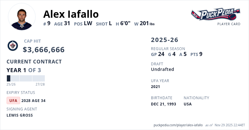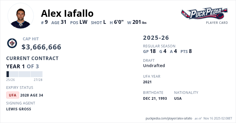 Alex Iafallo is signed to a 3 year, $10,999,998 contract with a cap hit of $3,666,666 per season, playing for the Winnipeg Jets. His contract expires at the end of the 2027-28 season, making Iafallo an Unrestricted Free Agent.