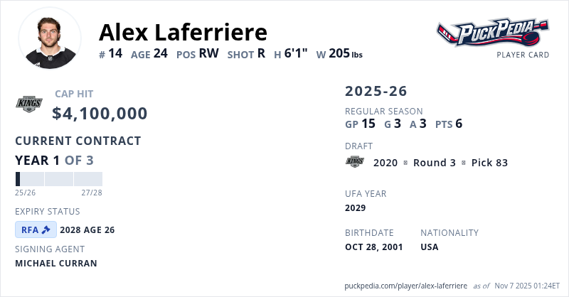 Alex Laferriere is signed to a 3 year, $12,300,000 contract with a cap hit of $4,100,000 per season, playing for the Los Angeles Kings. His contract expires at the end of the 2027-28 season, making Laferriere a Restricted Free Agent.