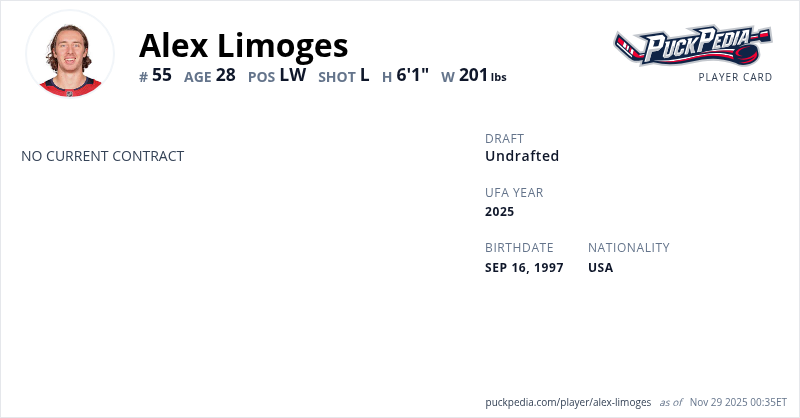 Alex Limoges is an Unrestricted Free Agent. His last contract was 1 year, $775,000 with a cap hit of $775,000 per season. It expired at the end of the 2024-25 season.