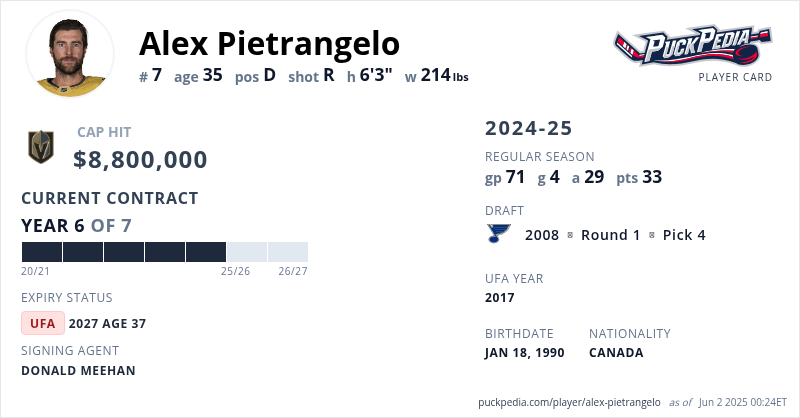 Alex Pietrangelo is signed to a 7 year, $61,600,000 contract with a cap hit of $8,800,000 per season, playing for the Vegas Golden Knights. His contract expires at the end of the 2026-27 season, making Pietrangelo an Unrestricted Free Agent.