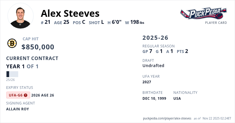 Alex Steeves is signed to a 1 year, $850,000 contract with a cap hit of $850,000 per season, playing for the Boston Bruins. His contract expires at the end of the 2025-26 season, making Steeves an Unrestricted Free Agent (Group 6).
